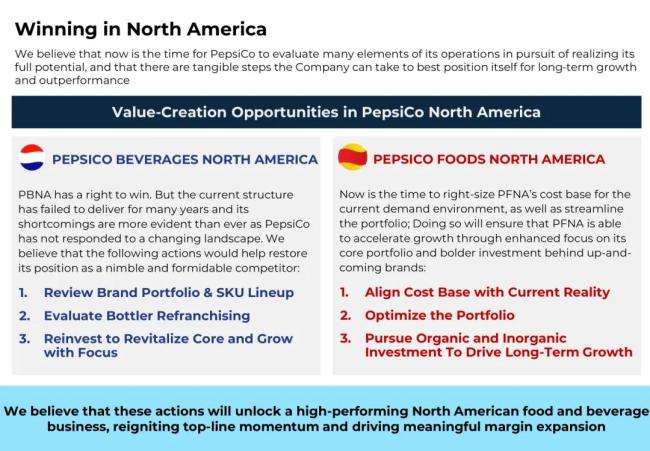 “现在是时候采取大胆行动了。”Elliott说道,通过能够打造一个更敏锐、更专注、更具竞争力的PBNA,该业务完全有能力夺回市场份额,加速收入增长,并实现显著的利润率增长。