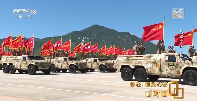 80面荣誉战旗分别来自抗战时期八路军、新四军、东北抗联、华南游击队等授称单位,由所在单位官兵擎旗受阅,寓意着伟大的抗战精神接续传承。