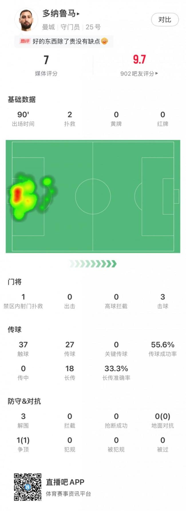 在英超第4轮的曼市德比中,曼城门将多纳鲁马迎来了他的首秀。比赛中,他完成了2次扑救,其中包括1次禁区内射门扑救。此外,他还进行了3次击球、37次触球以及27次传球,传球成功率为55.6%。多纳鲁马尝试了18次长传,准确率为33.3%,并有3次解围和1次成功的争顶。