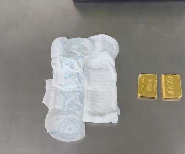 进一步检查中,关员在该旅客贴身穿着的卫生巾内发现了两块用绿色胶纸缠绕的疑似黄金块。经深圳海关工业品检测技术中心鉴定,确认这些物品为足金块。女子卫生巾内藏674克足金被海关查获 走私手法惊人!