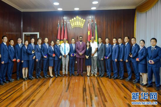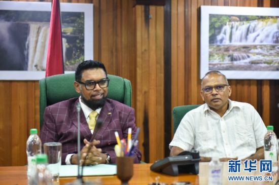 圭亚那总统伊尔凡·阿里(左)在圭亚那首都乔治敦总统办公室会见即将离任的中国(江苏)第20期援圭亚那医疗队(中国医疗队供图)
