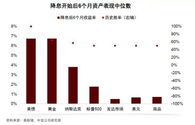 美联储降息会显著影响各类资产走势。从历史数据来看,美债是降息周期的最大受益者,尤其是短端利率敏感度更高。中金统计显示,降息开始后6个月内,美债胜率接近100%。利率降低意味着债券价格上涨,美联储降息周期中美债收益率下行概率达80%以上。短端利率如1年期与政策利率高度同步,而长端利率如10年期受通胀预期和期限溢价影响,波动更大。若经济陷入衰退,长端利率可能先暴跌后反弹。兴业证券指出,预防式降息后,美债利率短期受流动性宽松压制,但若经济转好可能反弹;衰退式降息下,美债利率将长期下行。天风证券认为,当前美债配置价值凸显,10年期收益率或下探至3.5%以下。