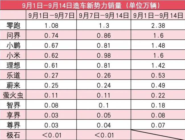 问界则排在第三位。上周,问界销量为0.86万辆,较前一周增长了0.12万辆。9月1日—9月14日,问界累计销量为1.6万辆,与小米持平。目前,问界的销量担当是M8,单周销量在0.5万辆左右。9月底,全新问界M7将迎来上市,这款车预售24小时订单就超过15万辆,市场关注度很高,预计上市后将再次成为问界的销量支柱。