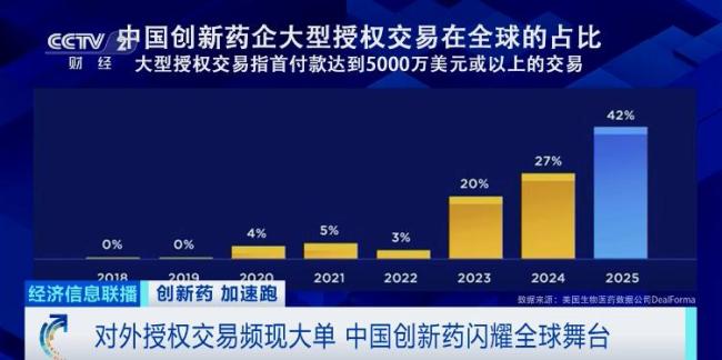 美国生物医药数据公司DealForma在今年5月份发布的报告显示,中国生物医药企业在全球大型授权交易中占比已达42%,这一比例相比去年的27%和前年的20%有显著增加。