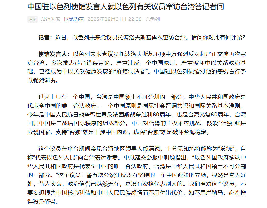 使馆发言人表示,以色列未来党议员托波洛夫斯基不顾中方强烈反对和严正交涉再次窜访台湾,多次发表涉台错误言论,严重违反一个中国原则,严重破坏中以关系政治基础,已经成为中以关系健康发展的“麻烦制造者”。中国驻以色列使馆对他的恶劣言行予以强烈谴责。