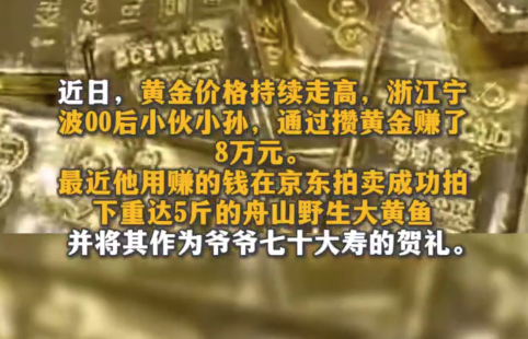 近日,浙江宁波00后小伙小孙用买黄金多年赚的8万元拍下一条珍稀的舟山野生大黄鱼,作为爷爷七十大寿加中秋的双重贺礼。
