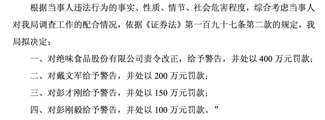湖南证监局拟决定:对绝味食品责令改正,给予警告,并处以400万元罚款;对绝味食品董事长兼总经理戴文军给予警告,并处以200万元罚款;对时任财务总监彭才刚给予警告,并处以150万元罚款;对时任董事会秘书彭刚毅给予警告,并处以100万元罚款。
