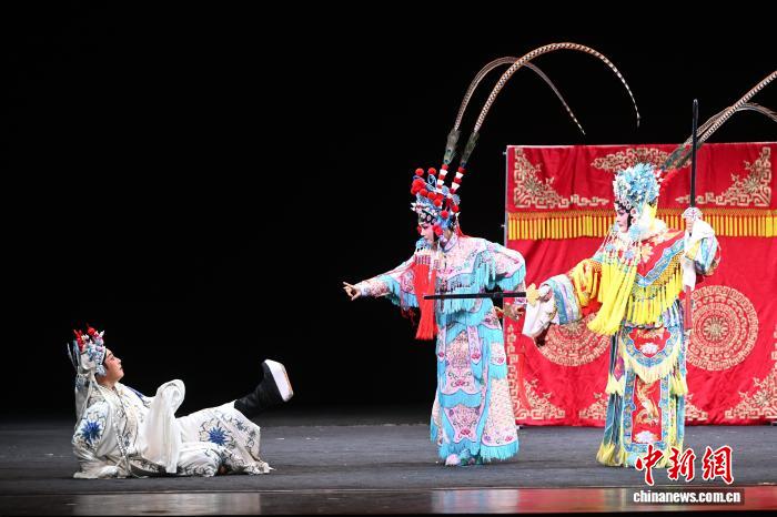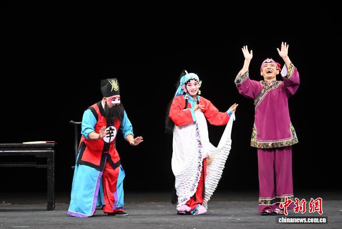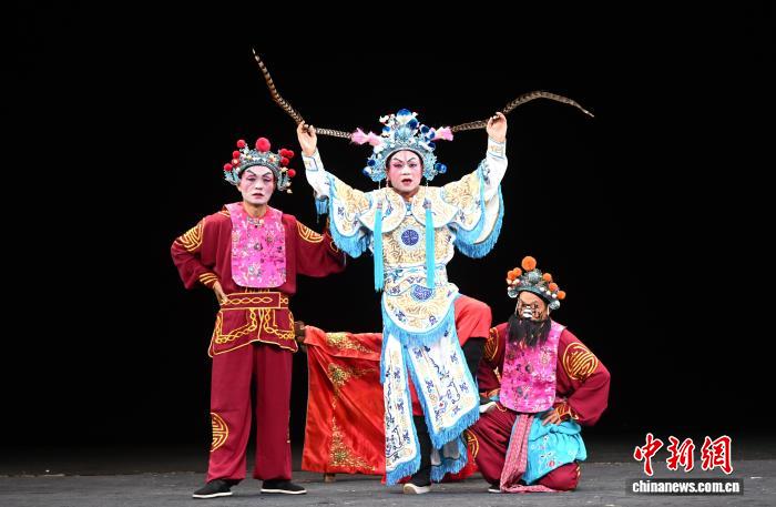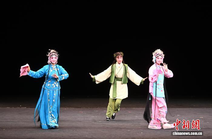 9月23日,福建福州,福建南平市南词艺术传承发展中心的演员正在表演南词戏《百花赠剑》选段。福建传统折子戏展演正在福州举行,当天,南词戏、三角戏、四平戏、梅林戏等福建稀有剧种集中上演。中新社记者 吕明 摄