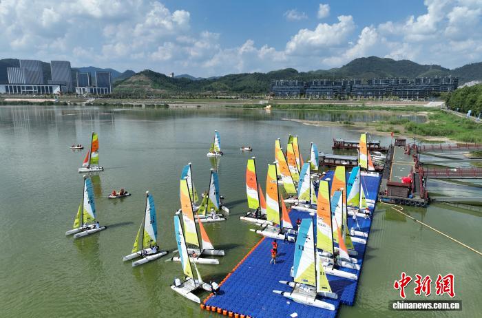 9月27日,众多帆船集结等待启航。当日,2025中国家庭帆船赛·杭州站在浙江杭州临安青山湖拉开帷幕,来自北京、上海、武汉等10个城市的40组家庭近百名选手在绿水青山间扬帆。中新社记者 王刚 摄