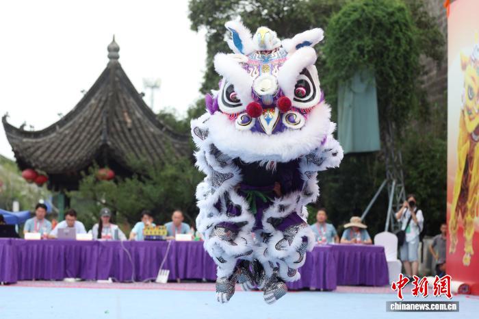 9月27日,在江苏南京举行的2025年世界华人狮王争霸赛传统南狮项目的比赛中,来自中国、新加坡、南非、美国等国家的参赛队伍轮番登台展绝活。图为南非开普敦华星龙狮团的成员在比赛中。中新社记者 泱波 摄