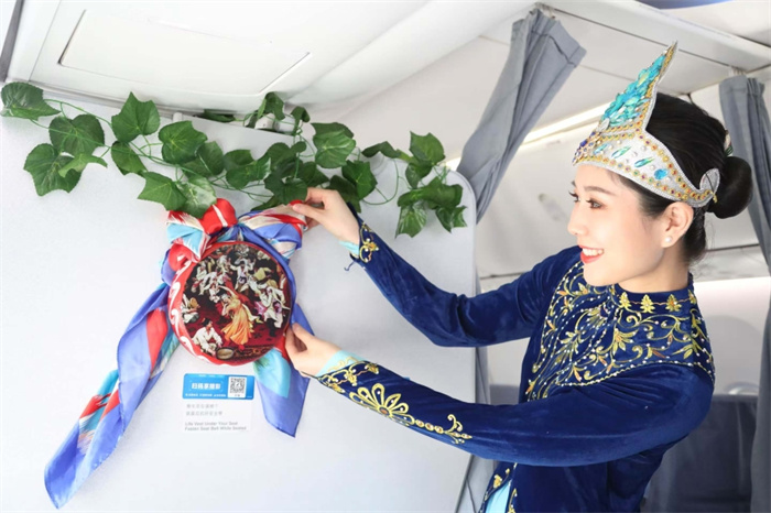 空乘人员摆放纪念复航陈设。南方航空供图