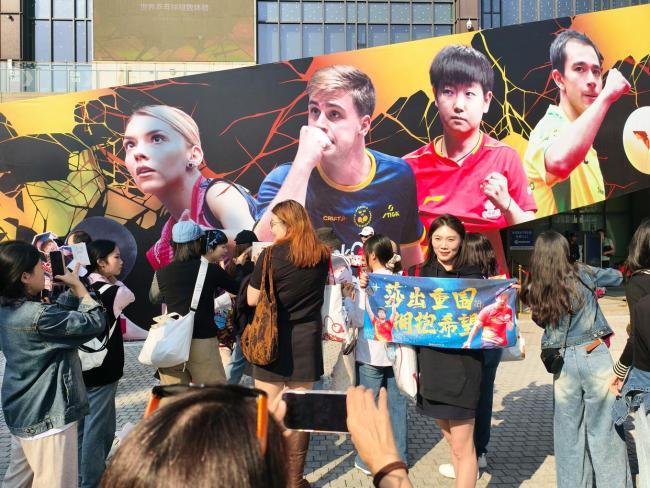 入口处设立的巨幅赛事背板成为焦点,众多球迷驻足合影打卡,记录这一乒乓盛宴的开幕时刻。笑容洋溢的脸庞与写满祝福的背板相映成趣,构成一道亮丽的风景线。这项顶级赛事的回归点燃了球迷的热情,也再次彰显了乒乓球运动在中国的深厚底蕴与无限活力。