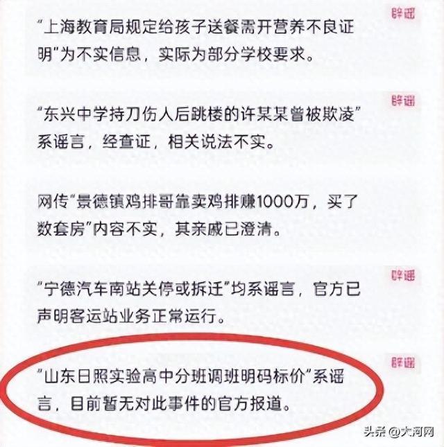 高中分班调班明码标价?校方回应 消息不实已澄清。近日,一则关于山东日照实验高中分班调班明码标价的消息在某短视频平台上流传。对此,校方和当地教育部门均表示该消息不实。目前学校实行“阳光分班”,整个过程公开透明,家长、老师等各方代表都会到场监督,由系统随机分班。