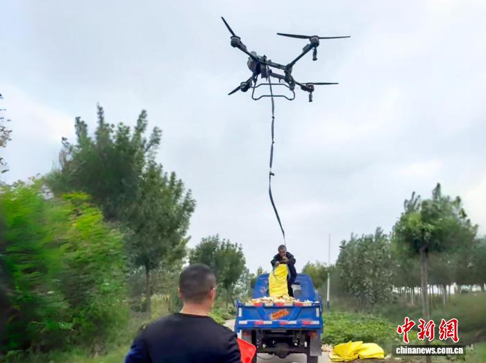 在菏泽鲁西新区吕陵镇窦庄村,植保无人机将掰下装袋的玉米运送到运粮车上。菏泽鲁西新区办公室供图