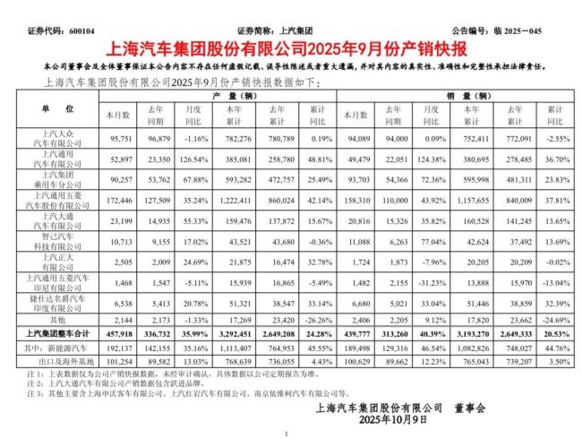 从今年1-9月来看,比亚迪累计销量达3,260,146辆,累计同比增长18.64%。而上汽集团在1-9月累计销售319.3万辆,同比增长20.5%,低于比亚迪。不过,上汽集团还特意强调了这是终端零售数据——为337.8万辆。与2024年的数据一样,上汽集团在终端的销量远高于批发数量,这与其他车企是相反的。这也意味着,上汽集团仍处于清库存的过程中,市场能力没有完全恢复,也说明了上汽集团的市场拓展潜力还很大。