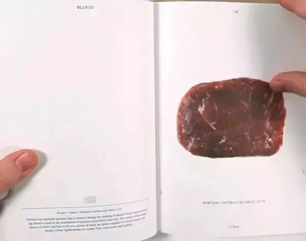 这可能是书中最无聊的部分?也不一定。看看下面这块牛肉吧。对,它是块牛肉,但05049号对它的生产亦有贡献。这种肉被称为“控量切割肉”,它其实是把零碎牛肉“粘起来”再切片的产物。具体怎么粘呢?其中一种方法就要用到从猪血中提取的纤维蛋白。