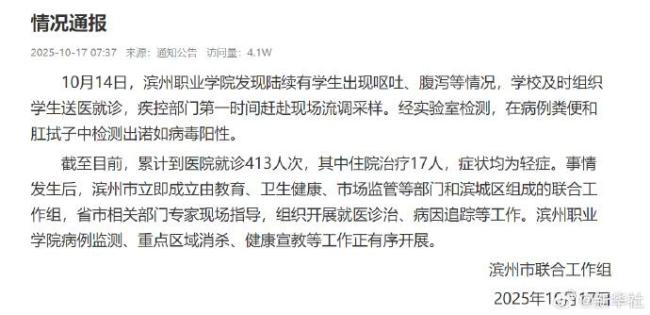 截至目前,已有413人次到医院就诊,其中17人住院治疗,但症状均为轻症。事件发生后,滨州市立即成立了由教育、卫生健康、市场监管等部门组成的联合工作组,省市相关部门专家也到场指导,开展就医诊治和病因追踪等工作。目前,滨州职业学院正在有序进行病例监测、重点区域消杀和健康宣教等措施。