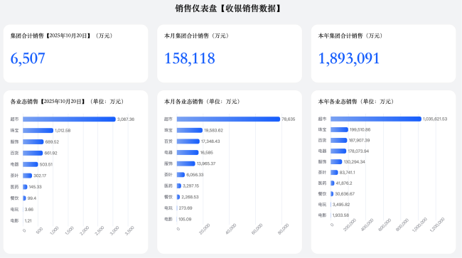 根据胖东来官网显示,截至2025年10月20日,本年度集团合计销售额已经达到了189.3084亿元,其中本月集团合计销售额就达到了15.811亿元。