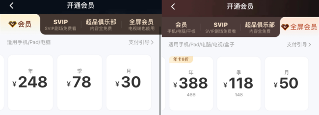 据悉,开通芒果TV会员,适用于手机/Pad/电脑会员包年248元、包季78元、包月30元;开通芒果TV全屏会员,适用于手机/Pad/电脑/电视/盒子会员包年388元(原价488元)、包季118元(原价148元)、包月50元。