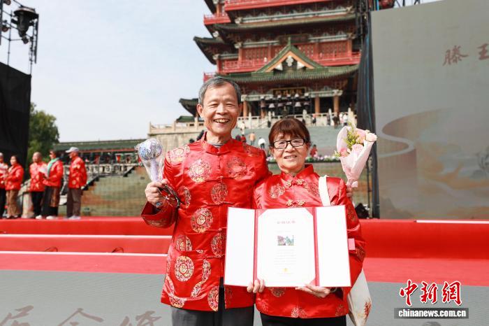 10月29日,正值重阳节,江西南昌滕王阁旅游区举办第八届金婚盛典活动,50对金婚夫妇齐聚滕王阁下,共度重阳佳节并庆祝金婚仪式。图为一对金婚老人,正在滕王阁前展示他们的金婚证书。中新社记者 刘思伟 摄