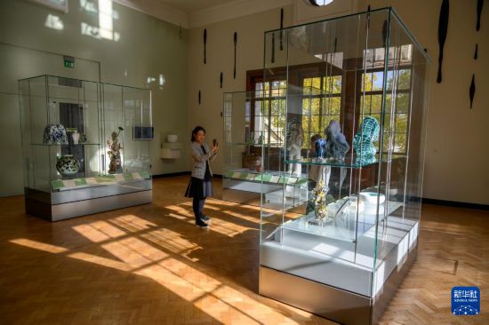10月27日,在英国伦敦维多利亚与阿尔伯特博物馆(V&A),一名女子在《多维:中国当代工作室工艺》展览媒体预展上拍摄。新华社发(雷伊·唐摄)