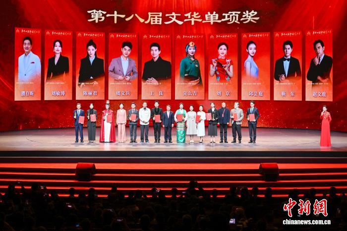 11月4日晚,第十四届中国艺术节闭幕式在重庆举行,第十八届文华奖(含剧目奖、节目奖、单项奖)正式揭晓。濮存昕、刘敏涛、陈丽君、虞文兵、王良、完么吉、刘京、邱芸庭、靳东、赵祐翧(赵文瑄)获评文华表演奖。图为文华表演奖颁奖仪式。中新社记者 何蓬磊 摄