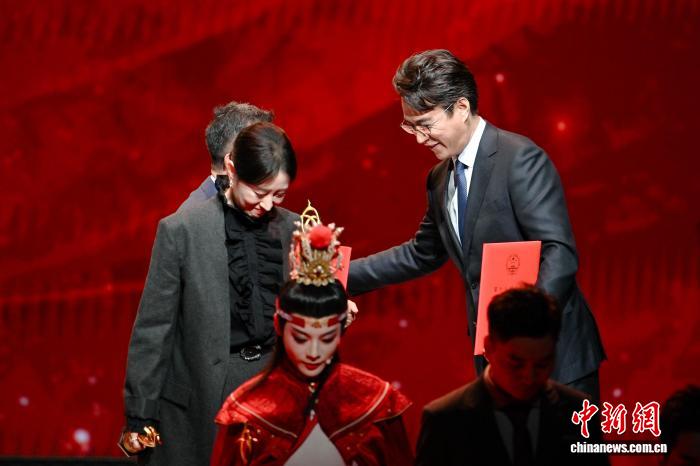 11月4日晚,第十四届中国艺术节闭幕式在重庆举行,第十八届文华奖(含剧目奖、节目奖、单项奖)正式揭晓。京剧《齐白石》、昆剧《牡丹亭》(全本)、扬剧《郑板桥》、婺剧《三打白骨精》、曲剧《鲁镇》、川剧《梦回东坡》、话剧《北上》、话剧《烟火人间》、话剧《生命册》、儿童剧《猫神在故宫》、歌剧《尘埃落定》、舞剧《醒·狮》、舞剧《红楼梦》、音乐剧《寻找李二狗》、杂技剧《先声》等15部作品荣获文华剧目奖。图为文华剧目奖颁奖仪式。中新社记者 何蓬磊 摄