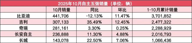 自主5强10月销量:吉利破30万,长城涨超20%,比亚迪第一但下滑