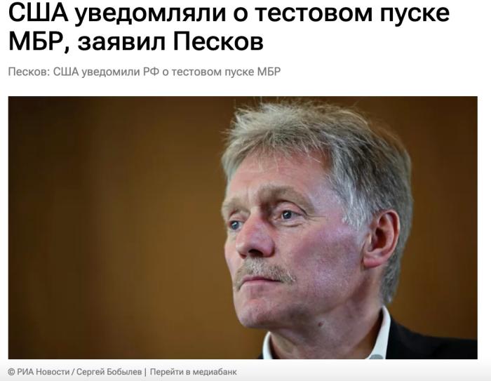 中新网11月6日电 据俄新社、俄罗斯卫星通讯社报道,当地时间11月5日,俄罗斯总统新闻秘书佩斯科夫表示,美方在试射“民兵3”洲际弹道导弹之前,提前向俄罗斯通报了相关信息,俄方将继续履行《全面禁止核试验条约》中规定的义务。
