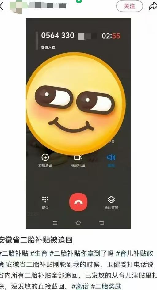 网友拨打六安市12345市长热线询问情况,得到裕安区卫生健康委员会回复,确认省内所有二胎补贴均需追回。记者进一步向裕安区卫健委办公室求证此事,对方表示需要等待省里下发文件后才能根据新政策发放补贴。