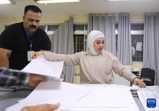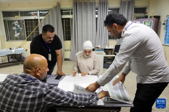 11月11日,工作人员在伊拉克巴格达一处投票站内清点选票。新华社发(哈利勒·达伍德摄)
