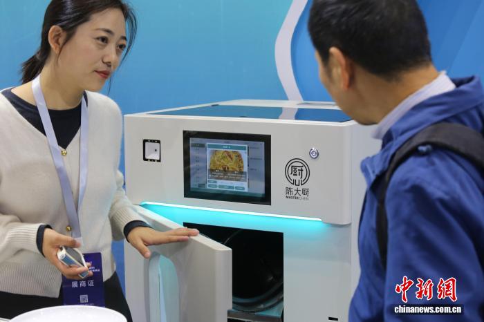 11月21日,2025第二届中国(郑州)数字化与先进装备制造业博览会在郑州国际会展中心开幕。本届博览会以“高端化、智能化、绿色化、融合化”为主题,设有数字化与未来产业展区、先进装备展区、工业自动化与机器人展区、新型电力设备与能源装备展区等。图为参会者了解智能炒菜机器人。中新社记者 刘鹏 摄
