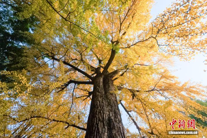 11月24日,初冬暖阳下,四川省眉山市东坡区纱縠行南街的三苏祠博物馆南门内,高大的银杏树渐染金黄,金黄叶片随风轻舞,吸引不少游客驻足观赏、拍照留念,现场洋溢着浓浓的诗意与雅致氛围。图为三苏祠南门的古银杏树渐染金黄。中新社记者 刘忠俊 摄