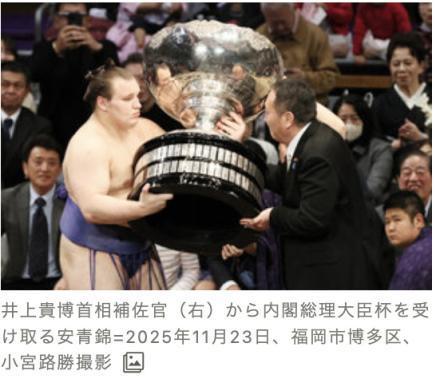 在日本福冈举行的大相扑九州场千秋乐上,内阁总理大臣杯由首相辅佐官井上贵博代为颁发,高市早苗未亲自出席授奖。日本相扑协会坚持传统规定,禁止女性进入相扑擂台,而高市早苗因出席G20峰会滞留南非未能到场。