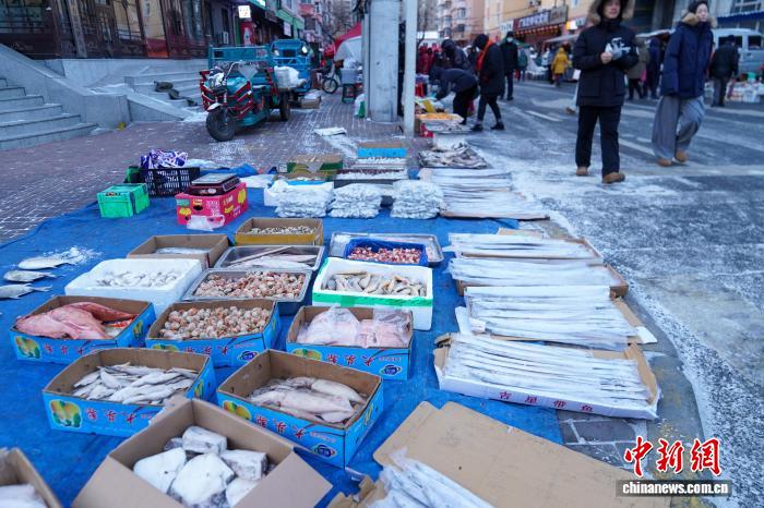 12月2日,黑龙江哈尔滨,各种冻鱼摆上街头售卖。当日,哈尔滨最高气温今冬首次降到-10℃以下,室外秒变“天然大冰箱”,商贩将冻鱼、冻鸡、冻柿子等摆上街头售卖。 中新社记者 赵宇航 摄
