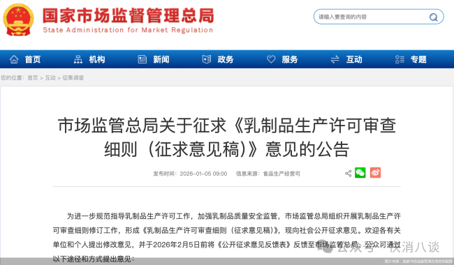 近日,国家市场监管总局就《乳制品生产许可审查细则(征求意见稿)》(以下简称《细则(征求意见稿)》)公开征求意见。《细则(征求意见稿)》在《企业生产乳制品许可条件审查细则(2010)版》的基础上,对现行细则中产品分类、生产场所、设备设施等进行修订完善。业内分析人士指出,此次《细则(征求意见稿)》的公开及时顺应了当前乳制品产品结构的变化,有利于小企业加快技术突破和创新,在细分领域拔得头筹。