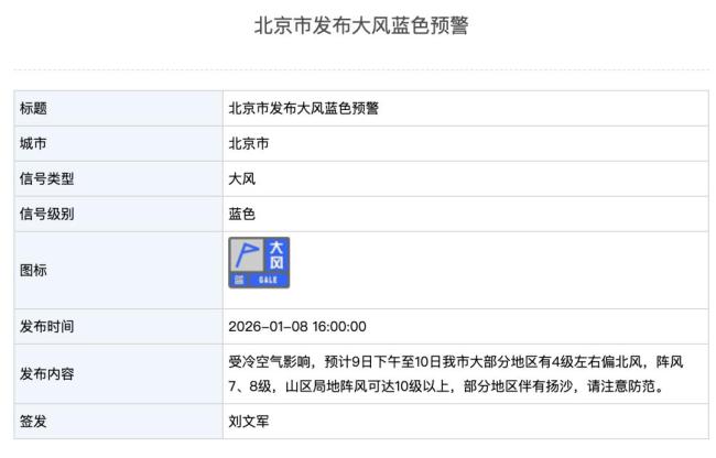 1月8日16时,北京市发布大风蓝色预警。受冷空气影响,预计9日下午至10日,北京市大部分地区将出现4级左右的偏北风,阵风可达7到8级,山区局地阵风甚至可能达到10级以上,部分地区伴有扬沙,请注意防范。