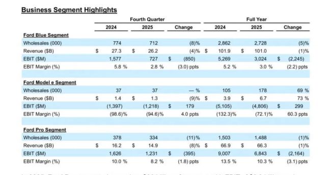分板块来看,福特的三大业务板块(Ford Blue、Ford Model e、Ford Pro)在2025年呈现差异化发展态势。首先,Ford Pro(商用车)延续强势表现。2025年,Ford Pro板块全年销量为148.8万辆,同比下滑1%。反映在财务数据上,2025年,Ford Pro板块营收663亿美元,同比下降1%;息税前利润68.43亿美元,同比下降24%;利润率为10.3%的两位数水平,同比下降了3.1个百分点,但依然是福特最核心的盈利来源。另外,Ford Pro付费软件订阅量增长30%,服务化收入成为该板块的新增长曲线。