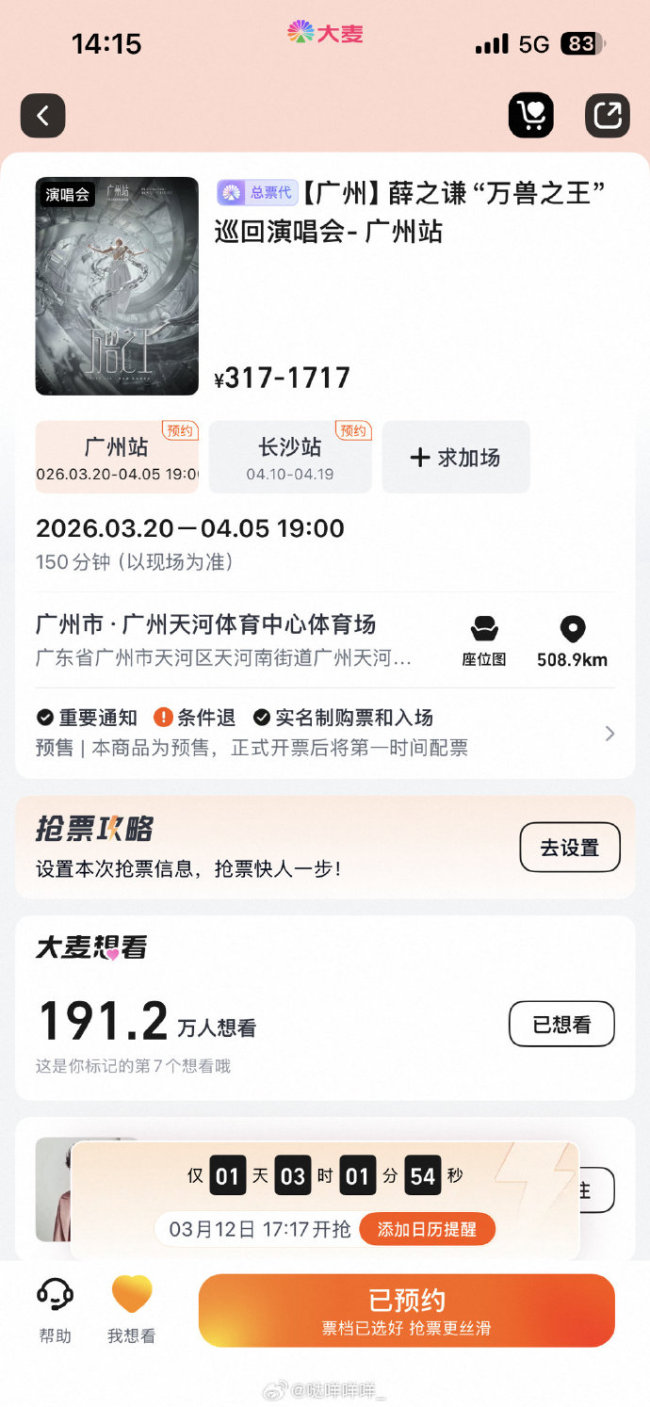薛之谦"万兽之王"巡回演唱会广州站的二次开票(二开)将于2026年3月12日17:17在大麦等平台启动,9场剩余门票统一开放销售。