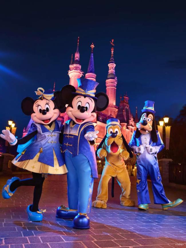 米奇和米妮身着典雅的蓝色礼服亮相,金色领巾中间嵌有一枚闪耀的星形胸针,方形领角缀满银蓝渐变细节,宛若流星洒落。米奇头戴饰有许愿星的高顶礼帽,帽顶采用独特弧形设计;米妮则肩披优雅披风。唐老鸭和黛丝的新装融入一抹优雅的紫色调,唐老鸭头戴圆顶礼帽,帽檐饰有星星纹样,搭配闪闪发光的马甲;黛丝则以紫色头饰搭配银色裙摆。高飞和布鲁托的服装增添一丝活力绿意,高飞身着亮面夹克,搭配绣有十字星纹样的喇叭裤;布鲁托的金色流星领圈之上饰以一枚绿色星星名牌。奇奇与蒂蒂的新装如星辰般亮眼,他们身着点缀着赤褐与古铜色的精致马甲,立领与金色袖口细节精致考究;两人头戴饰有金色星星与流苏的帽子。