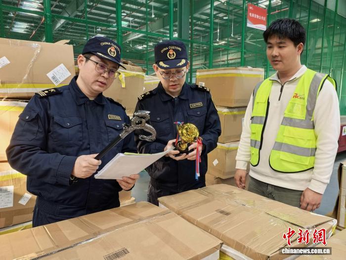 3月31日,松江海关派员对松江综保区前置货站内一批跨境电商出口工艺品进行开箱检查。张玉楠 摄
