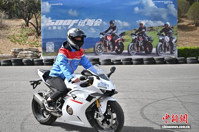 4月3日,张雪机车太原门店工作人员正在驾驶张雪机车500RR车型。中新社记者 韦亮 摄