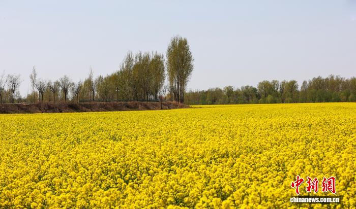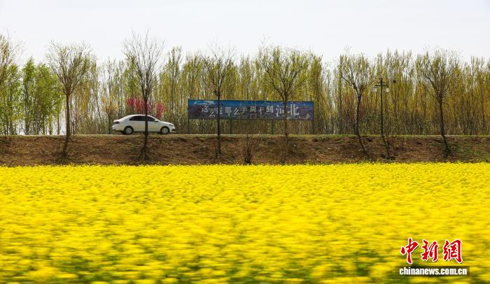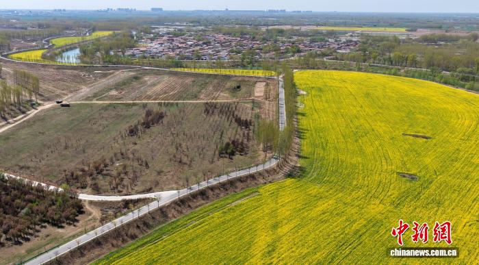 仲春时节,全国“十大最美农村路”——大运河堤顶路河北沧州段焕新姿。这条绿色“廊道”以盎然春意串联起生态美景、文化传承与民生幸福,成为市民游客踏青、健身、游览的好去处。图为4月7日,大运河堤顶路沧州南皮段油菜花田。(无人机照片) 呼阳 摄