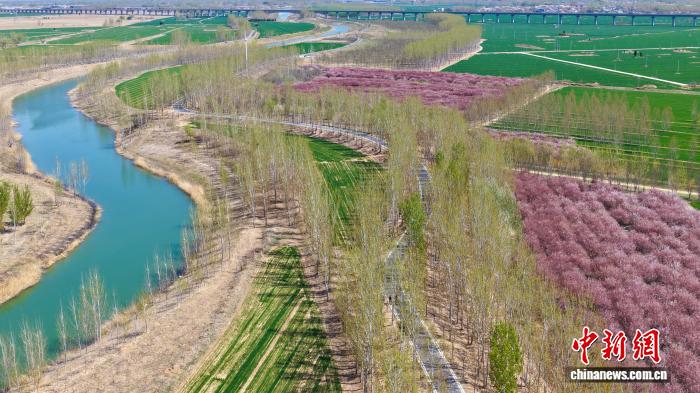 仲春时节,全国“十大最美农村路”——大运河堤顶路河北沧州段焕新姿。这条绿色“廊道”以盎然春意串联起生态美景、文化传承与民生幸福,成为市民游客踏青、健身、游览的好去处。图为4月7日,大运河堤顶路沧州段周边繁花盛开。(无人机照片) 董国池 摄