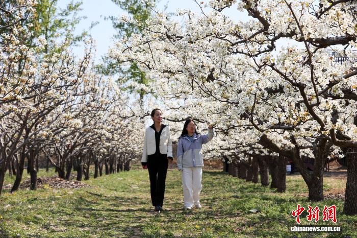 仲春时节,全国“十大最美农村路”——大运河堤顶路河北沧州段焕新姿。这条绿色“廊道”以盎然春意串联起生态美景、文化传承与民生幸福,成为市民游客踏青、健身、游览的好去处。图为4月7日,大运河堤顶路沧州段,游人在梨园赏花。 董国池 摄