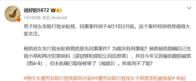 女子被男友殴打致残后遭威胁 案件进展引发关注!还记得那个让全网气到发抖的“北京独生女被男友打致坐轮椅”案吗?现在终于有新动静了——民事案件要在4月10日开庭。