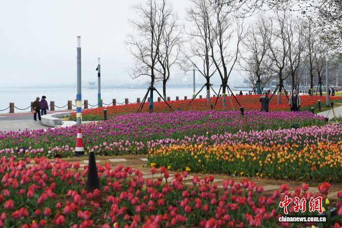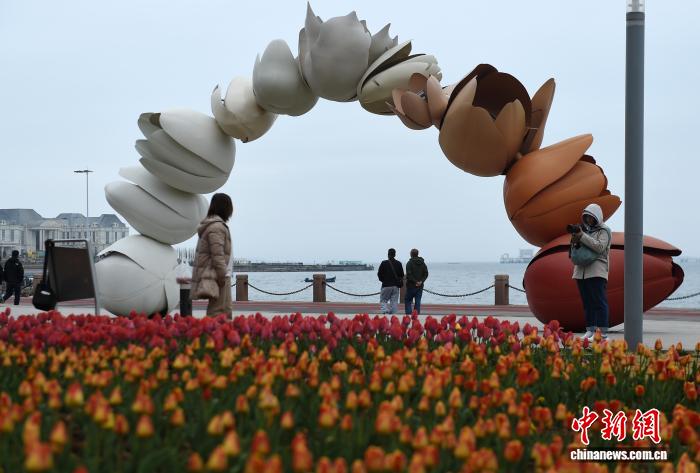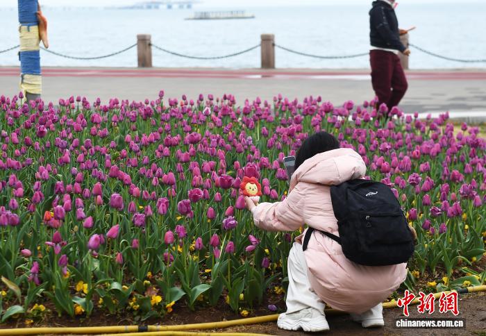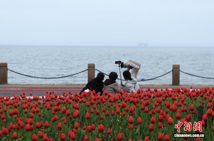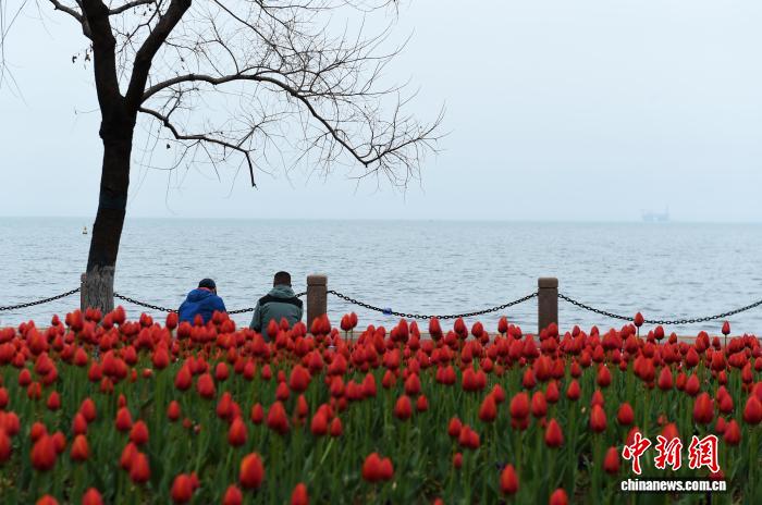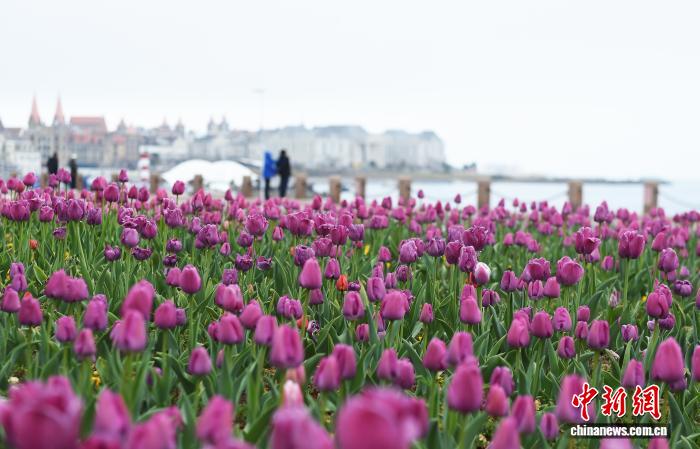 4月9日,山东烟台海滨,春雨初霁后的郁金香渐次绽放。市民与游客漫步于海畔花径,感受“面朝大海,春暖花开”的滨海春韵。中新社记者 王娇妮 摄