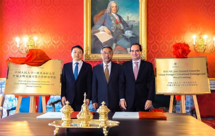 中国人民大学校长马怀德、中国驻葡萄牙大使杨义瑞、科英布拉大学副校长若奥·努诺·卡尔文·达席尔瓦出席仪式并致辞,共同为中葡文明交流互鉴合作研究中心揭牌。