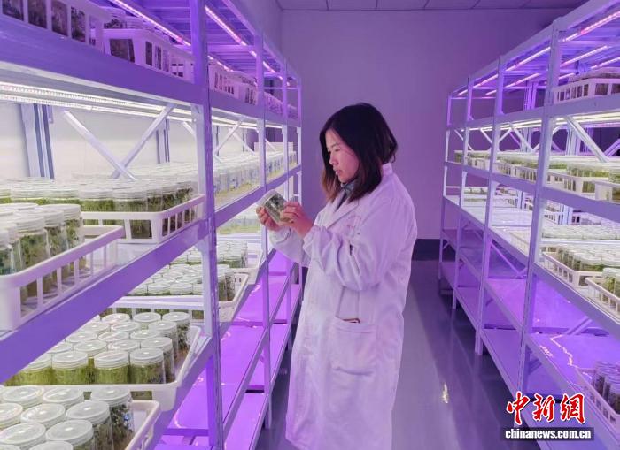 图为林团荣观察组培苗长势情况。乌兰察布市农林科学研究院供图