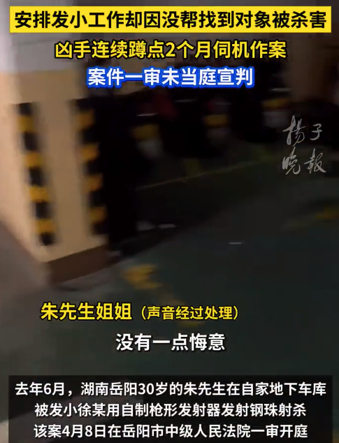 去年6月,湖南岳阳30岁的朱先生,在自家地下车库,被蹲守在此的发小徐某用枪形发射器击发钢珠射杀。该案于4月8日上午一审开庭,法院未当庭宣判。被害人家属朱女士告诉扬子晚报记者,徐某在庭审中不认为他的所作所为是犯罪,反而声称自己是受害者,毫无悔意。